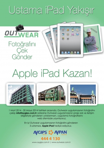 1 Mart 2014 - 30 Mayıs 2014 tarihleri arasında, Outwear uygulamasının fotoğrafını çekip info@aygips.com.tr adresine Outwear uygulamasının proje adı ve iletişim bilgileriyle gönderen ustalarımızın, uygulama fotoğraflarını web sitemizde yayınlıyoruz. En iyi Outwear uygulamasının fotoğrafını gönderen 3 ustamıza, Apple ipad hediye ediyoruz.